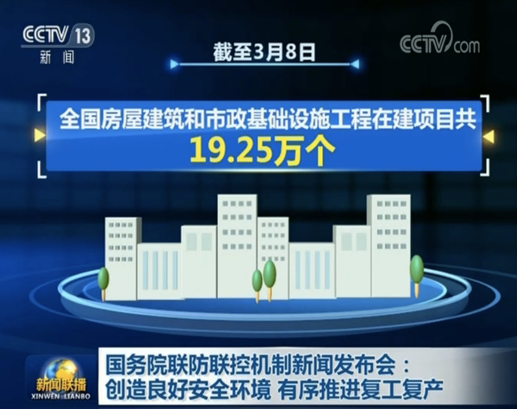 而住房城乡建设部则指导住房和城乡建设领域,扎实开展疫情防控和有序推进企业复工复产,截至3月8日,全国房屋建筑和市政基础设施工程在建项目共19.25万个,已开复工11.19万个,开复工率达到58.15%。