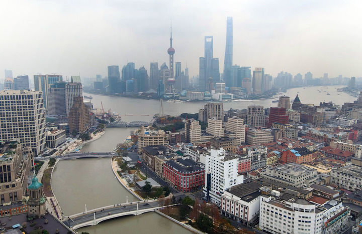 从空中俯瞰苏州河(下)与黄浦江的交汇处(无人机照片,2020年12月29日摄)。 新华社记者 方喆 摄