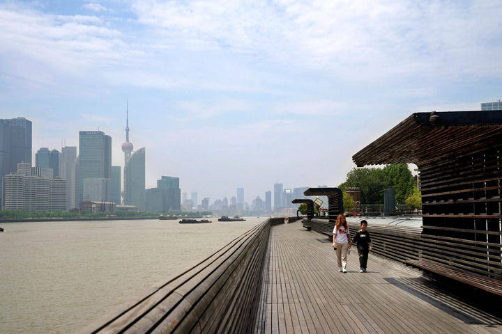 5月15日,市民在杨浦滨江公共空间休闲漫步。 新华社记者 刘颖 摄