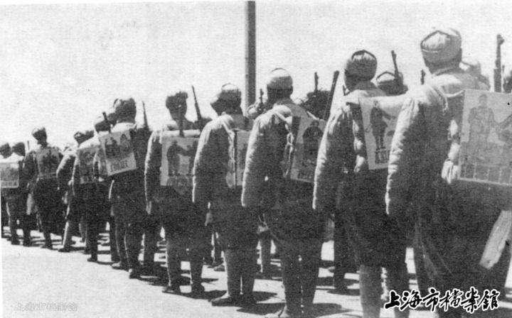 进入上海前,解放军将《入城守则和纪律》的内容绘成图片,挂在战士们的背包上,一边行军一边学习(资料照片)。 新华社发(上海市档案馆提供)
