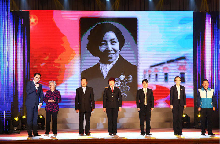 在2017年举办的纪念五四运动98周年主题团日活动中,上世纪50年代闻名全国的“青年突击手”、老一辈纺织工人黄宝妹(左二)带领新老青年突击队队员同台亮相(2017年5月4日摄)。 新华社记者 刘颖 摄