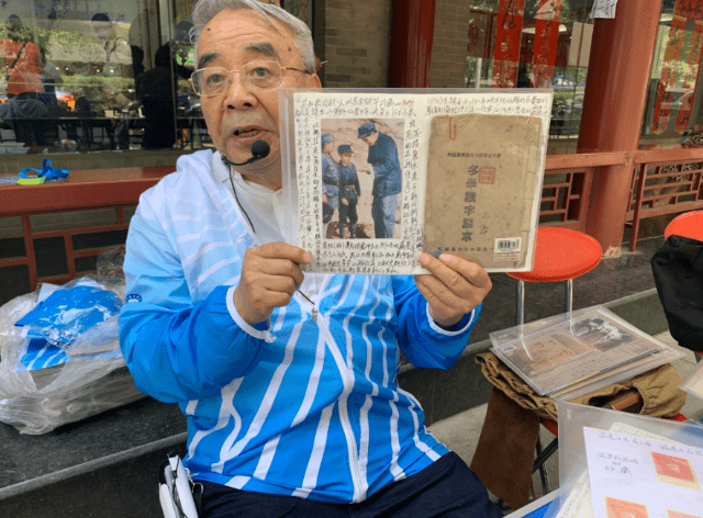 金铁华举起一张旧明信片,上面印着毛泽东和两个小八路。他讲道:“1939年,毛泽东同志来到位于延安东关黑龙沟的抗大校务部,参加抗大生产运动初步总结大会。当他快到抗大校务部门前时,有两个小八路从山坡上跑下来,兴冲冲地来到毛主席跟前问好。‘你们知道我是谁吗?’‘知道,您是毛主席!’‘不对!我不叫毛主席,我叫毛泽东。’说着,毛泽东同志弯下腰,在自己的手心上把‘毛泽东’三个字写了一遍,耐心地边写边教两个小八路。照片中毛泽东同志平易近人、与八路军小战士亲密无间……”72岁的金铁华嗓音洪亮,他声情并茂地讲解,吸引了许多路过的男女老少驻足倾听。