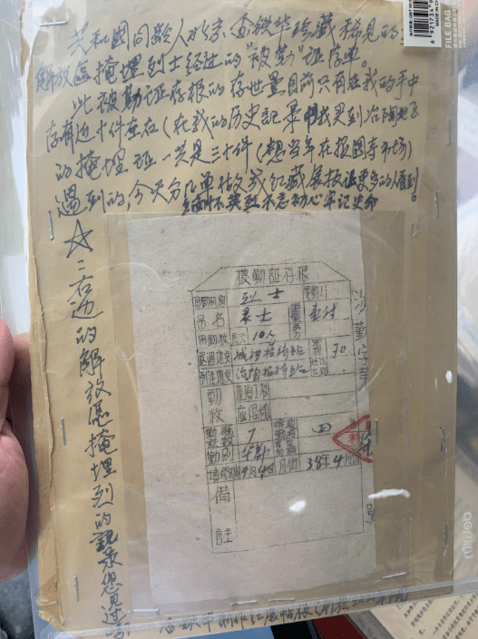 这一次他带上街头的红色藏品中,有一件珍贵的解放区掩埋烈士的“拨勤证存根”。上面写着填发日期为“38年4月”,用勤机关为“烈士”,但并没有留下烈士的具体姓名。“这份存根是我多年前在报国寺市场找到的,当时它被摆在地摊上不起眼的角落里无人问津,摊主卖的价格也很便宜。当我发现它时,感到万分伤心,这是当年掩埋烈士的原始记录,比出版物还要珍贵。”金铁华将它收藏后,悉心做好保护封层,并添上了注解。