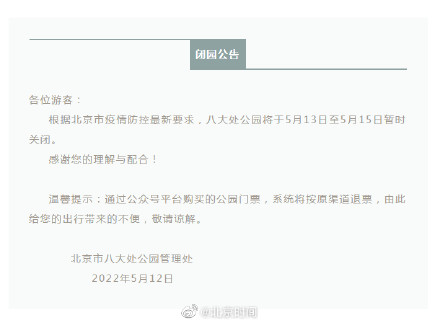 原标题:八大处公园5月13日至5月15日暂时闭园