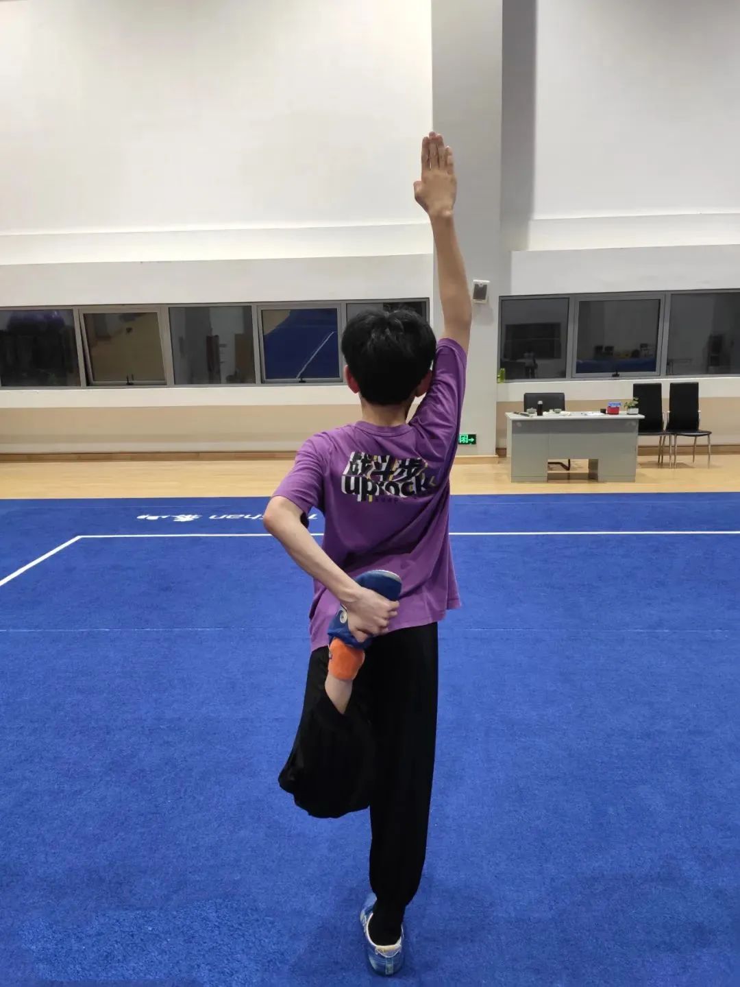 动作要领:保持身体直立,腿伸直,将左脚向身体后侧拉伸至静止状态,右手伸直打开至耳后。