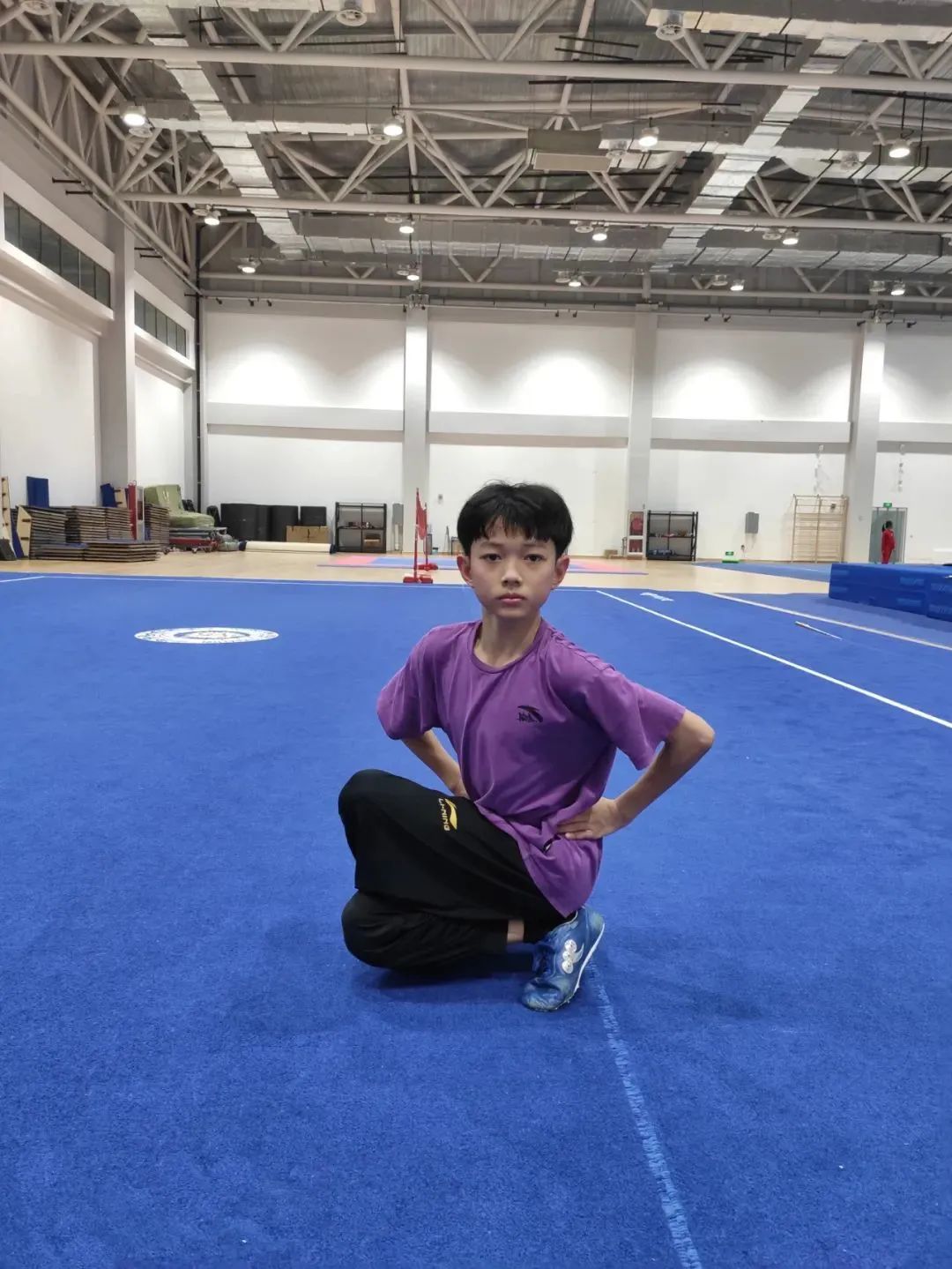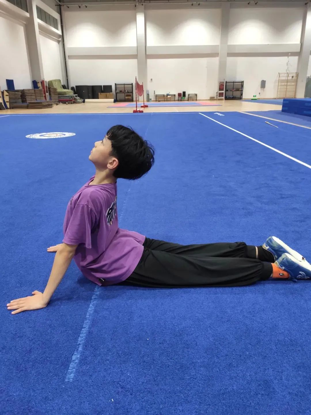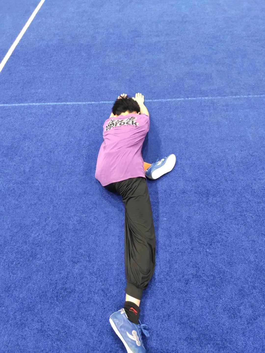 动作要领:右腿向后伸直,左腿屈膝向前压腿,身体向前挺直,收紧腹部,双手放于身体前方,直臂撑住地面。