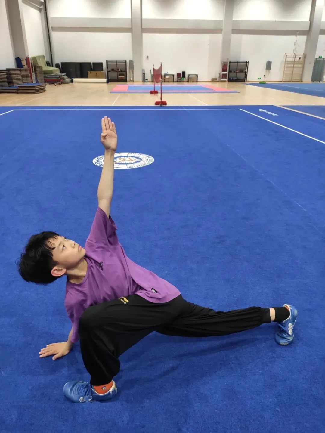 动作要领:两腿呈弓步状态,右手扶地,左手拧转向后打开,两臂角度垂直,腰部与肩部呈牵拉状态。