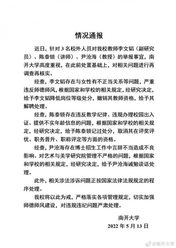 原标题:3名教师被实名举报!南开大学通报对涉事教师处理情况