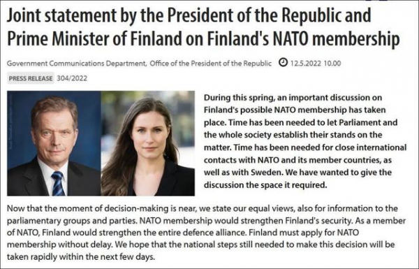5月12日,芬兰总统、总理发表联合声明,宣布支持芬兰申请加入北约,并尽快将有关决定提交议会批准;瑞典执政党社会民主党也在近日宣称,将于5月15日就该国是否申请加入北约作出决定。