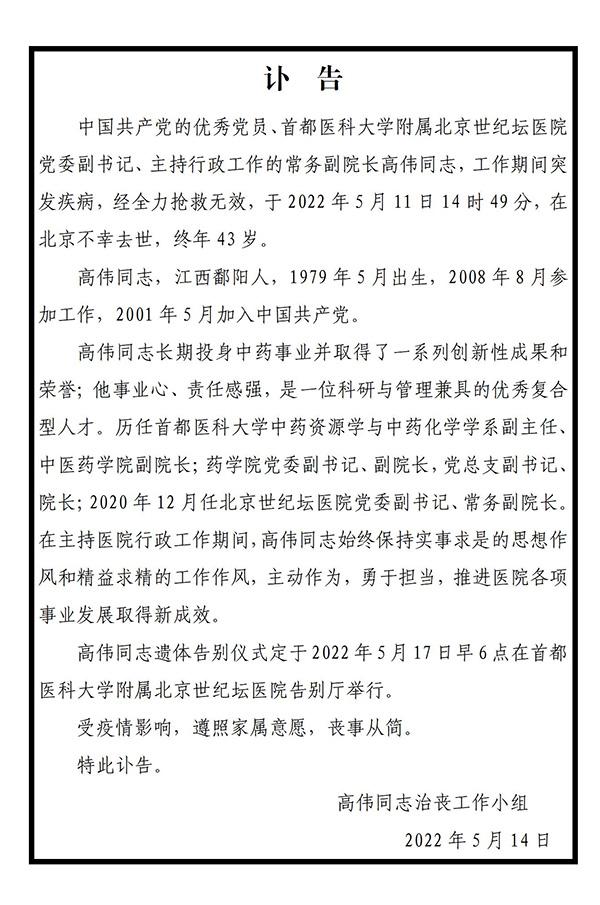 据首都医科大学附属北京世纪坛医院高伟同志治丧工作小组消息,中国共产党的优秀党员、首都医科大学附属北京世纪坛医院党委副书记、常务副院长高伟同志,工作期间突发疾病,经全力抢救无效,于2022年5月11日14时49分,在北京不幸去世,终年43岁。