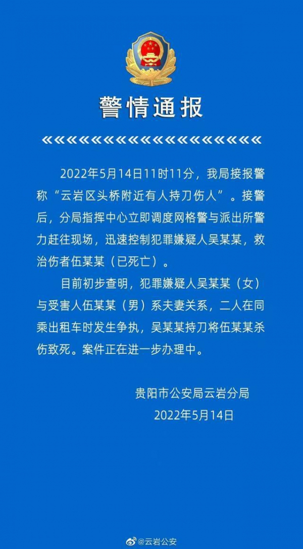 2022年5月14日11时11分,我局接报警称“云岩区头桥附近有人持刀伤人〞。接警后,分局指挥中心立即调度网格警与派出所警力赶往现场,迅速控制犯罪嫌疑人吴某某,救治伤者伍某某(已死亡)。 目前初步查明,犯罪嫌疑人吴某某(女)与受害人伍某某(男)系夫妻关系,二人在同乘出租车时发生争执,吴某某持刀将伍某某杀伤致死。案件正在进一步办理中。