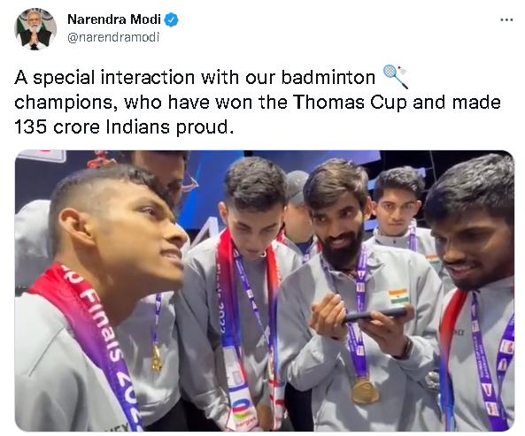 这是印度首次在汤姆斯杯夺冠。据印度新德里电视台(NDTV)报道,当印度羽毛球男队赢得汤姆斯杯后,印度总理莫迪亲自打电话向队员们表示祝贺。莫迪还在社交媒体上分享了一段队员接听电话的视频,并配文“与我们的羽毛球冠军进行了特别的互动,他们赢得了汤姆斯杯,让13.5亿印度人感到自豪”。