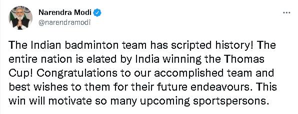 这是印度首次在汤姆斯杯夺冠。据印度新德里电视台(NDTV)报道,当印度羽毛球男队赢得汤姆斯杯后,印度总理莫迪亲自打电话向队员们表示祝贺。莫迪还在社交媒体上分享了一段队员接听电话的视频,并配文“与我们的羽毛球冠军进行了特别的互动,他们赢得了汤姆斯杯,让13.5亿印度人感到自豪”。