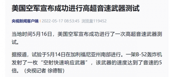 据报道,试验于5月14日在加利福尼亚州南部进行。一架B-52轰炸机发射了一枚“空射快速响应武器”,该武器的速度达到了音速的5倍。