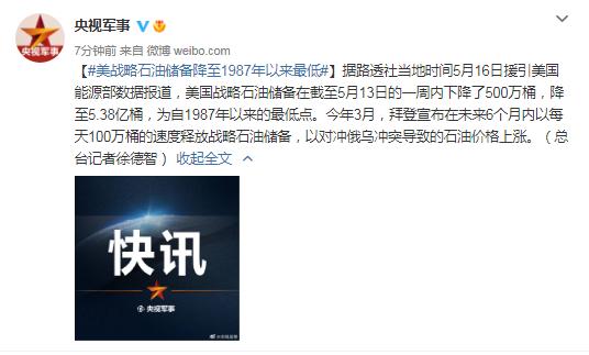 据路透社当地时间5月16日援引美国能源部数据报道,美国战略石油储备在截至5月13日的一周内下降了500万桶,降至5.38亿桶,为自1987年以来的最低点。今年3月,拜登宣布在未来6个月内以每天100万桶的速度释放战略石油储备,以对冲俄乌冲突导致的石油价格上涨。