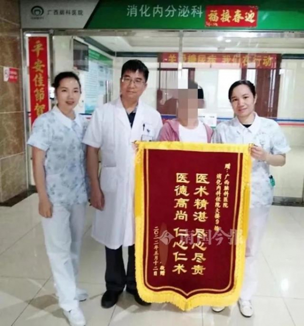 由于摆脱了频频打嗝的困扰,韦的心情也愉悦起来了。5月12日国际护士节,她的家属向该院消化内分泌科的医护人员赠送锦旗表达谢意。