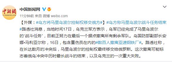 原标题:外媒:乌方将马里乌波尔控制权移交俄方!