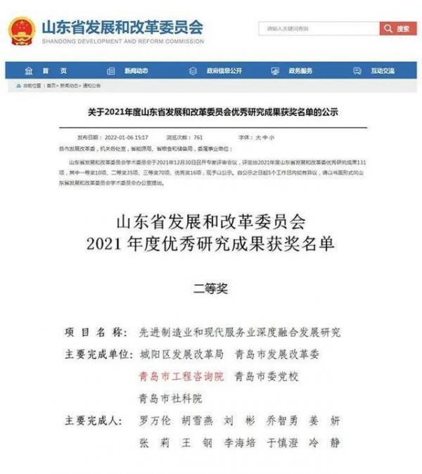 日前,山东省发展和改革委学术委员会正式发布《关于2021年度山东省发展和改革委员会优秀研究成果获奖名单的公示》,青岛市工程咨询院与城阳区发展改革局、青岛市发改委、青岛市委党校、青岛市社科院共同完成的“先进制造业和现代服务业深度融合发展研究”荣获二等奖。