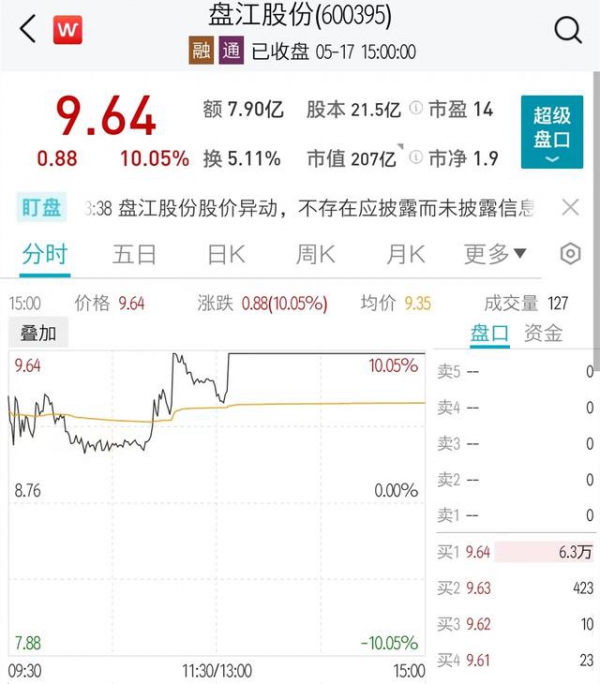 5月17日,盘江股份涨停,收获二连板,截至收盘,报9.64元,成交额7.90亿元。