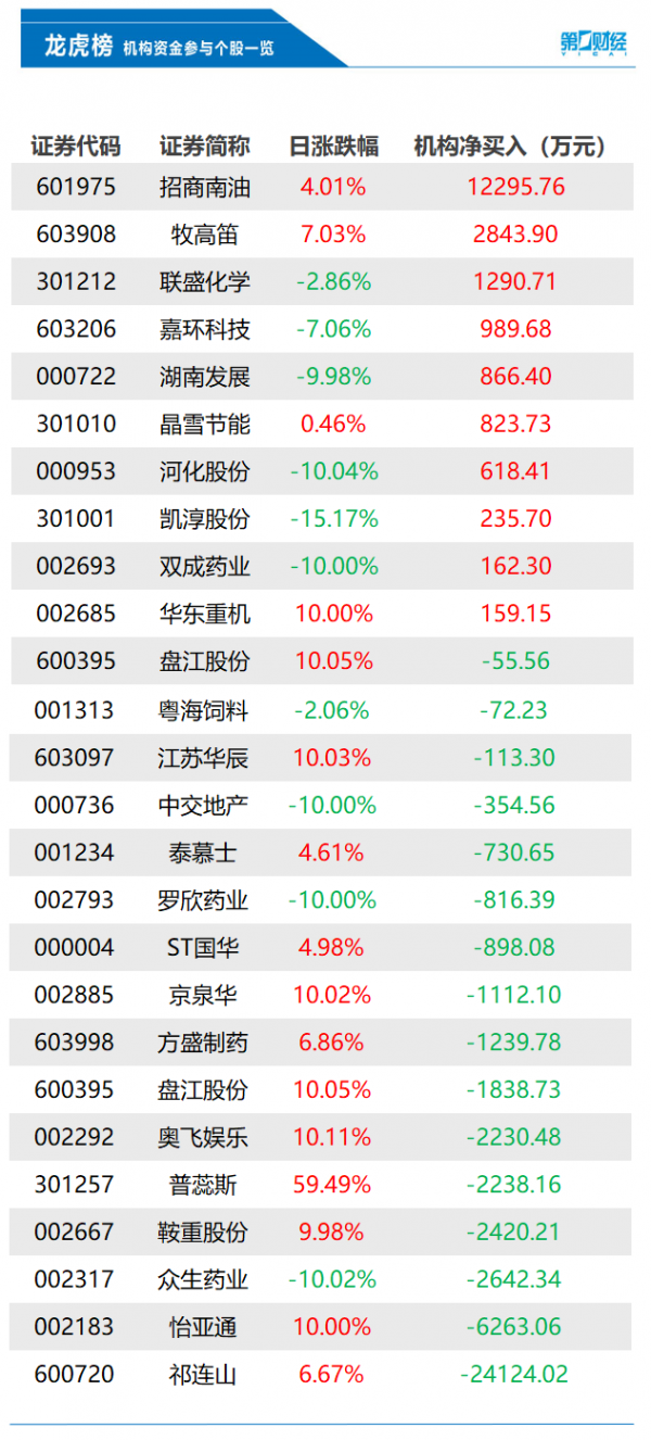 当天机构净买入前三的股票分别是招商南油、牧高笛、联盛化学,净买入金额分别是1.23亿元、2844万元、1291万元。