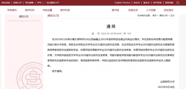 原标题:山西师范大学:追回多名已毕业研究生的国家助学金并上缴国库