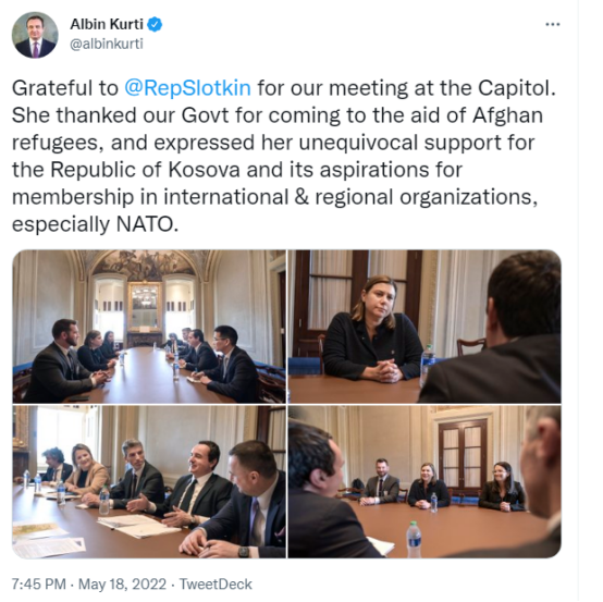 当天,库尔蒂还在推特上发文说,美国密歇根州民主党众议员埃莉萨斯洛特金“明确支持”科索沃加入“国际和地区组织,特别是北约”的愿望。↓