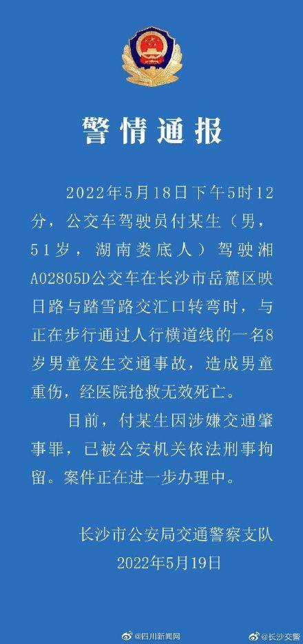 长沙交警19日发布警情通报:5月18日下午5时12分,公交车驾驶员付某生(男,51岁,湖南娄底人)驾驶湘 A02805D公交车在长沙市岳麓区映日路与踏雪路交汇口转弯时,与正在步行通过人行横道线的一名8岁男童发生交通事故,造成男童重伤,经医院抢救无效死亡。目前,付某生因涉嫌交通肇事罪,已被公安机关依法刑事拘留。案件正在进一步办理中。