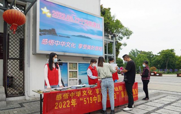 5月19日,在巢湖姥山岛景区游客服务中心,LED大屏正播放着“中国旅游日”公益宣传广告,现场还设置了咨询服务台,工作人员向广大市民及游客免费发放文旅宣传资料、文创产品和绿色环保礼品袋,在展示巢湖文旅资源和发展成果的同时,提倡广大游客爱护环境、绿色出行。5月13日,在紫微洞景区也举办了一场“中国旅游日”主题宣传活动。