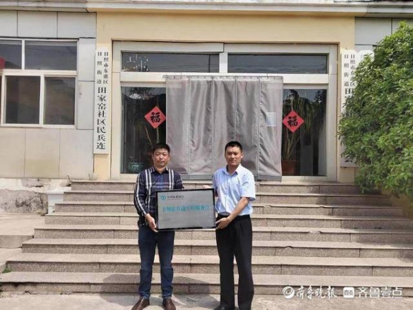 图为农行日照分行赴日照街道挂职干部杜斌和田家窑村支部书记田东共同为服务点揭牌