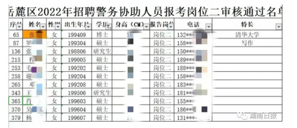 据长沙市岳麓区5月21日公布的《岳麓区2022年招聘警务协助人员报考审核通过名单公告》显示,在通过“警务协助人员岗位二”审核的人员表格中,出现了众多本科硕士人员,最高学历为一位张姓女博士,特长备注为“清华大学”,此外还有研究生10人,本科生349人。