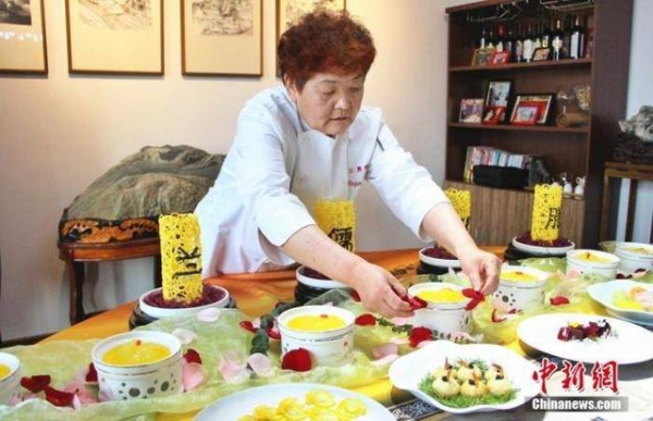 资料图为中国孔府菜首位女传人、山东省兰儒孔膳文化研究院院长王兴兰装点餐桌。中新社记者 赵晓 摄