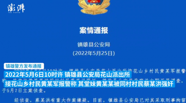 2022年5月6日10时许,云南省昭通市镇雄县公安局花山派出所接花山乡村民黄某军报警称:其堂妹黄某某被同村村民蔡某洪强奸。镇雄县公安局受案并立即开展调查,于5月7日立案侦查。