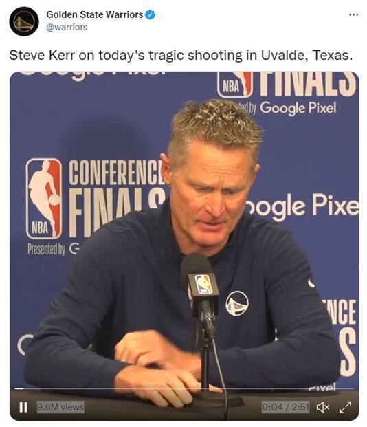 得州小学枪击案发生后,NBA金州勇士队主教练史蒂夫科尔在发布会上哽咽质问