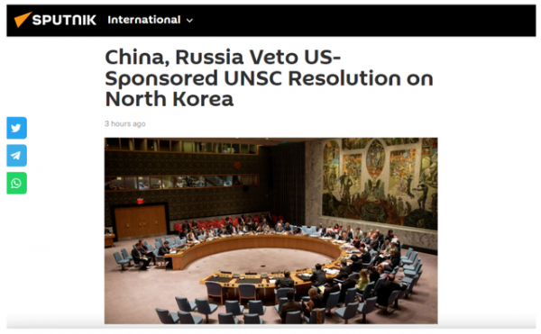 俄卫星社:中国、俄罗斯否决美国发起的联合国安理会关于朝鲜问题的决议