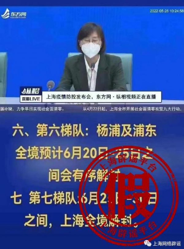 5月27日,上海辟谣平台接到很多网友留言,询问网传“上海解封将有七个梯队”的视频及截屏是否属实,因为相关视频和截屏使用了上海市新冠肺炎疫情防控工作新闻发布会的现场直播画面。经核查,相关信息不实,属于移花接木的造谣行为。