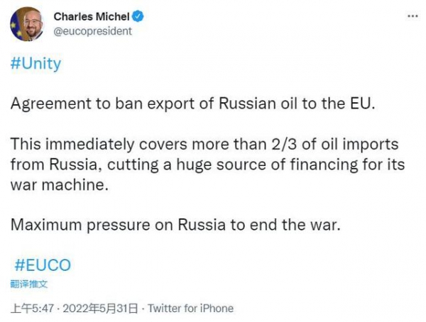中新网5月31日电 据美国有线电视新闻网(CNN)报道,当地时间30日,欧洲理事会主席米歇尔在社交媒体上表示,欧盟已就对俄实施石油禁运达成共识,“将立即覆盖三分之二欧盟从俄罗斯进口的石油”。