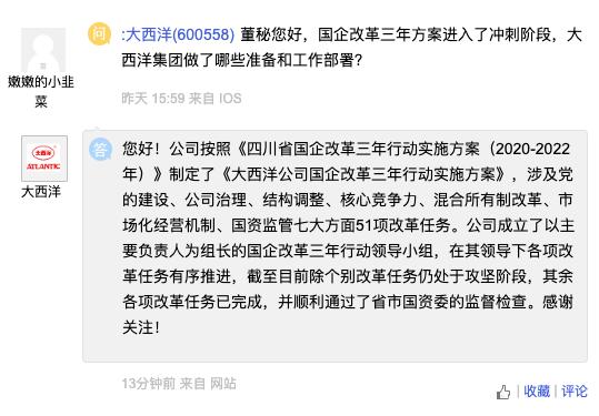 大西洋5月31日在“上证e互动”平台回答投资者提问称:公司按照《四川省国企改革三年行动实施方案(2020-2022年)》制定了《大西洋公司国企改革三年行动实施方案》,涉及党的建设、公司治理、结构调整、核心竞争力、混合所有制改革、市场化经营机制、国资监管七大方面51项改革任务。公司成立了以主要负责人为组长的国企改革三年行动领导小组,在其领导下各项改革任务有序推进,截至目前除个别改革任务仍处于攻坚阶段,其余各项改革任务已完成,并顺利通过了省市国资委的监督检查。