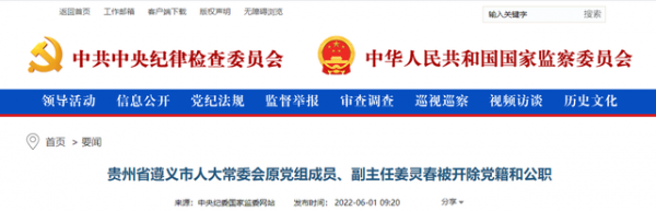 原标题:贵州省遵义市人大常委会原党组成员副主任姜灵春被开除党籍和公职