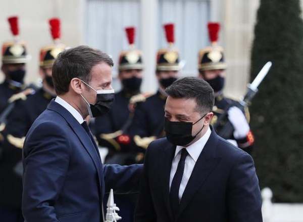 资料图 2021年4月16日,在法国巴黎总统府爱丽舍宫,法国总统马克龙(左)欢迎到访的乌克兰总统泽连斯基。新华社发