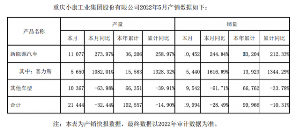 6月1日晚间,小康股份披露产销快报:2022年5月份,新能源汽车销量10452辆,同比增长244.04%,今年累计销量33204辆。其中,赛力斯销量5440辆,同比增长1616.09%,今年累计销量13923辆。
