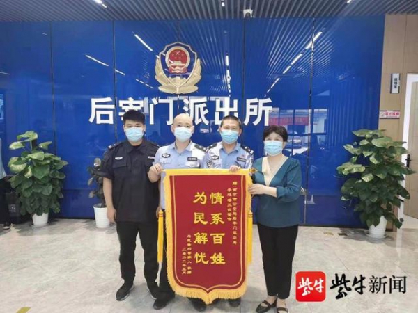 图文扬子晚报网6月1日讯(通讯员 周潇 记者 陈勇)5月31日,市民陈女士带着印有“情系百姓 为民解忧”字样的锦旗,来到后宰门派出所,对此前通宵帮忙寻找自己走失小姨的民警表示感谢。