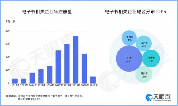 Kindle等阅读器背后,是一个庞大的电子书市场。天眼查数据显示,我国目前有超2700家企业名称或经营范围含“电子图书、电子书”,且状态为在业、存续、迁入、迁出的电子书相关企业。其中,约43%的相关企业注册资本在100万以下,约63%的相关企业成立于5年之内。从地域分布来看,广东省有超600家企业,位居全国第一;随后是湖北、四川、山东,均有超200家相关企业。