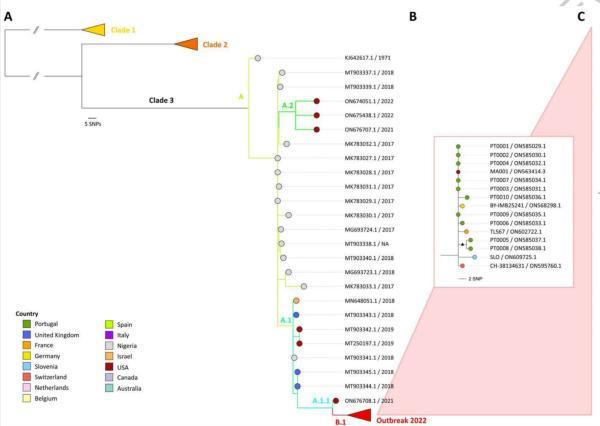 研究发现,2022年猴痘病毒集群(谱系B.1),形成了2018—2019年从猴痘流行国家(尼日利亚)向英国、以色列和新加坡输出的猴痘病毒分支(谱系A.1)的后代,并与2017-2018年尼日利亚发生的大规模猴痘疫情有遗传联系。鉴于这些发现和猴痘流行病学历史分析,研究者认为,2022年猴痘疫情的出现很可能源自病毒从猴痘流行国家的输出,疫情中出现的病毒,极有可能是由2017-2018年尼日利亚疫情中的猴痘病毒的持续传播和演变而来。