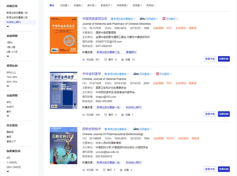 通过中文期刊名、关键词、CN号、ISSN号的检索,我们可以快速定位到想查询的期刊。即使我们没有确定好目标期刊,也可以根据用户浏览量、收藏数、影响因子、审稿周期等条件进行快速排序,了解其他用户都在查询哪些期刊,哪些期刊近期最热门。