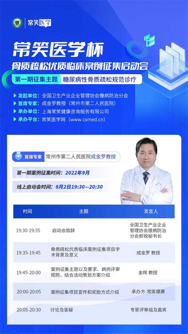 为深入总结骨质疏松临床诊疗经验,搭建学术沟通的桥梁,由全国卫生产业企业管理协会慢病防治分会主办,上海常笑健康咨询服务有限公司协办、常笑医学全程技术支持的第一期“常笑医学杯”临床案例征集活动在2022年9月全面启动。