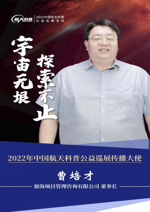 2022年8月21日,源海项目管理咨询有限公司董事长曹培才受邀为2022年中国航天科普公益巡展传播大使,在中央电视塔中国航天科普主题展区参加航天科普公益巡展活动。