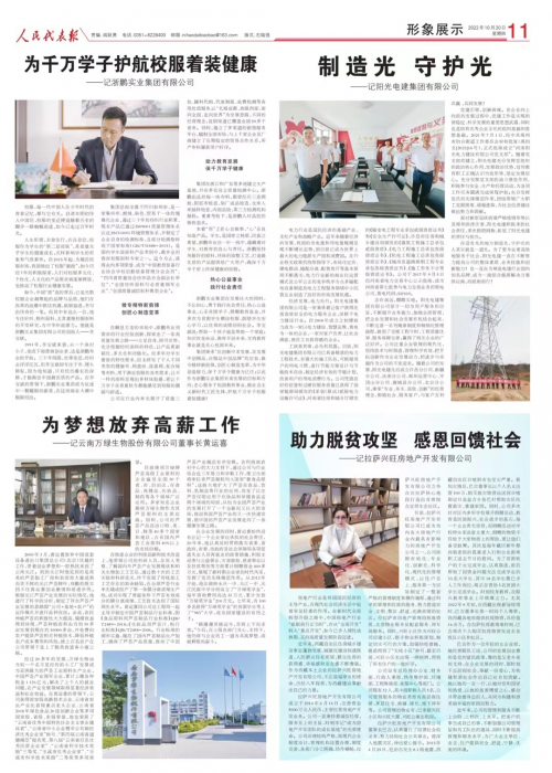 10月20日,受到全国各级人大尤其是全国人大常委会领导的关心和爱护,得到全国各地人大代表大力支持的《人民代表报》在重要版面的“形象展示”专栏刊发题为《为千万学子护航校服着装健康 》的专题报道,详细展示浙鹏实业集团有限公司做社会主义新时代工匠先锋,为千万学子护航校服着装健康的匠心故事。