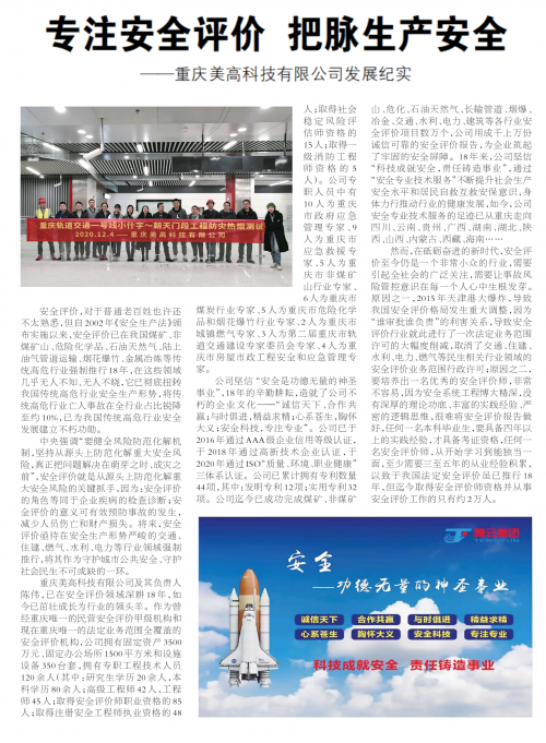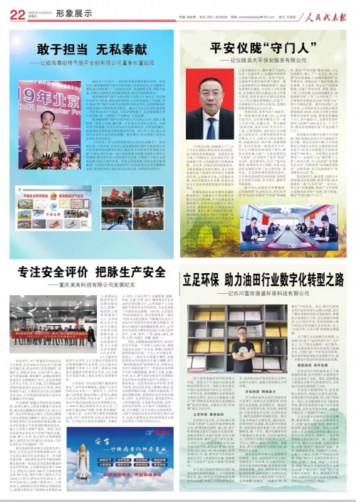10月20日,受到全国各级人大尤其是全国人大常委会领导的关心和爱护,得到全国各地人大代表大力支持的《人民代表报》在重要版面的“形象展示”专栏刊发题为《专注安全评价,把脉生产安全》——重庆美高科技有限公司发展纪实的专题报道,详细展示了重庆美高科技有限公司做社会主义新时代工匠先锋,为守护城市公共安全保驾护航的故事。