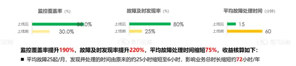 总结WeOps近2个月的投产情况:监控的覆盖率提升190%,故障及时发现率提升220%,平均故障处理时长缩短72%,预计每年因故障影响业务运行状态的时间可减少72小时。