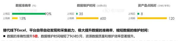 以往坚美铝业信息部门的资产管理,是每位管理员依靠Excel表记录各自负责的IT资产配置信息,并无统一汇总资源管理,这导致IT数据分散,信息准确率低、数据维护工作量大。WeOps上线使用后,CMDB实现从无到有的突破,运维人员告别手动操作,资产更新实现80%自动化,资产数据准确性提升5倍;并且每月可节约超过1天的人工维护成本,运维人员轻松应对半年度的资产盘点,可以花更多的时间精力在业务系统优化和建设上。